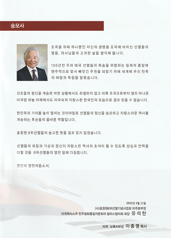 미국 민주평화통일자문회의 달라스 협회장 겸 효창원 8위선열기념사업회 미주본부장 유석찬