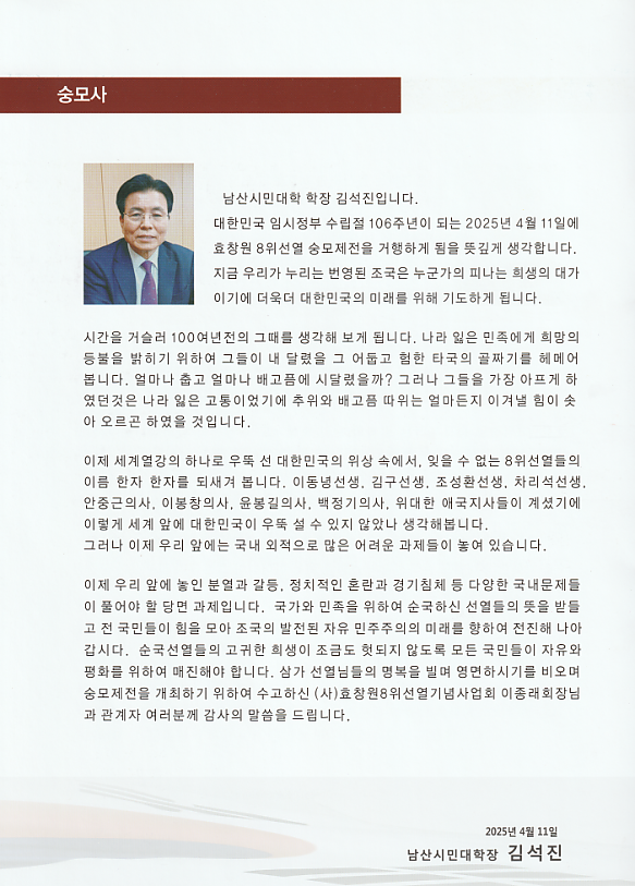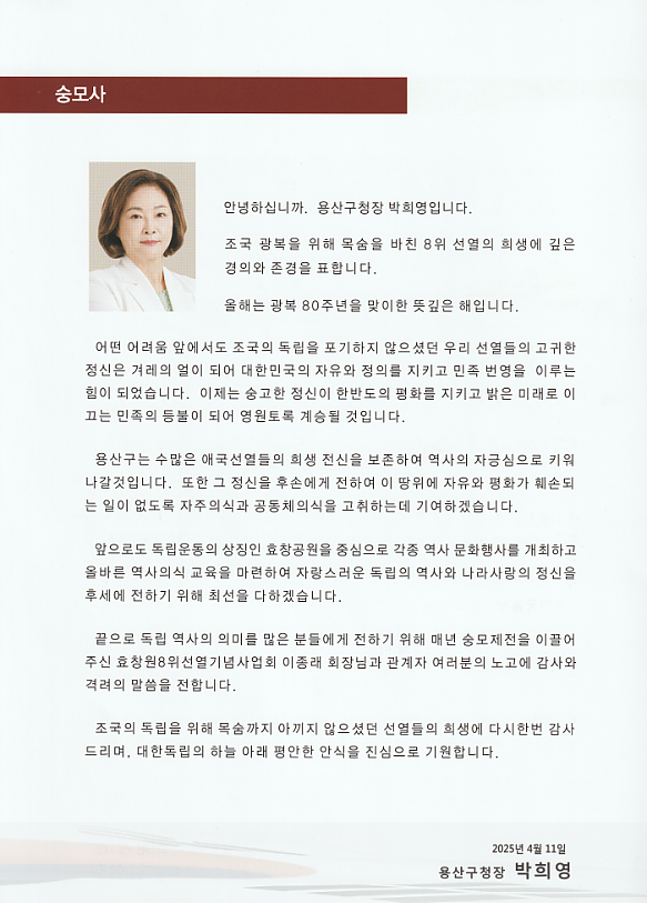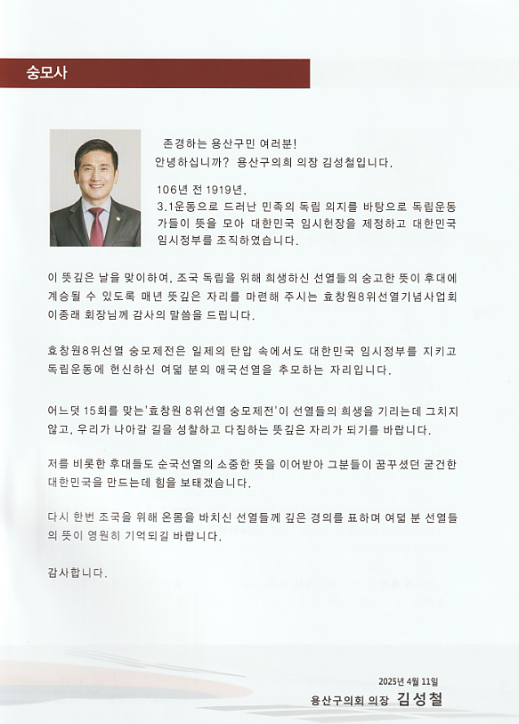 추모 축전 인사 1 페이지 > 효창원8위선열기념사업회