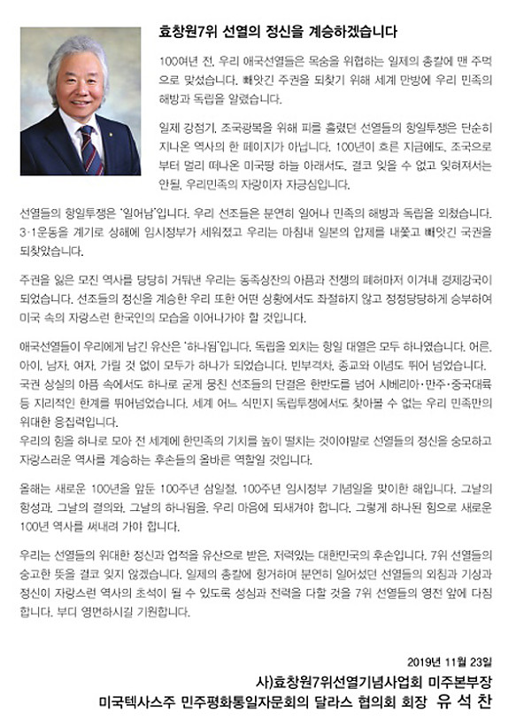 미국 민주평화통일자문회의 달라스 협회장 겸 효창원 7위선열기념사업회 미주본부장 유석찬