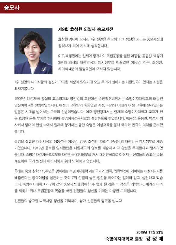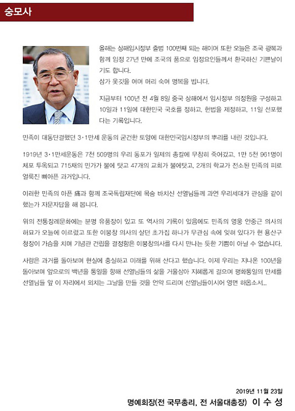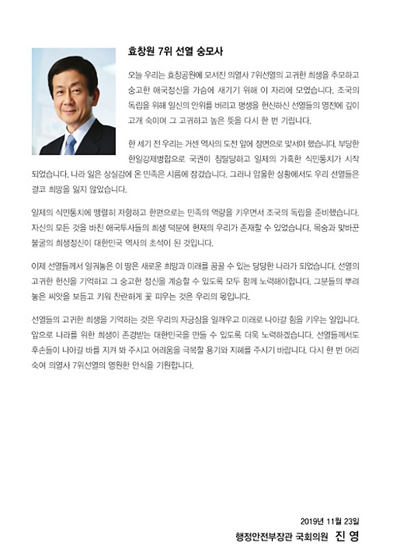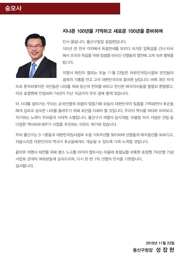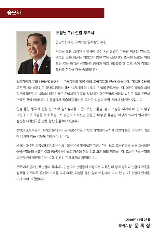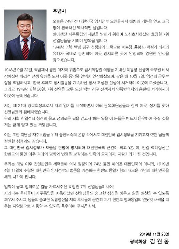 추모 축전 인사 1 페이지 > 효창원8위선열기념사업회