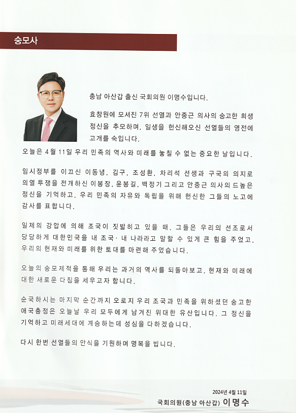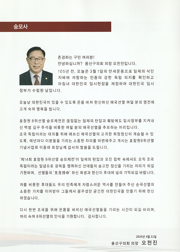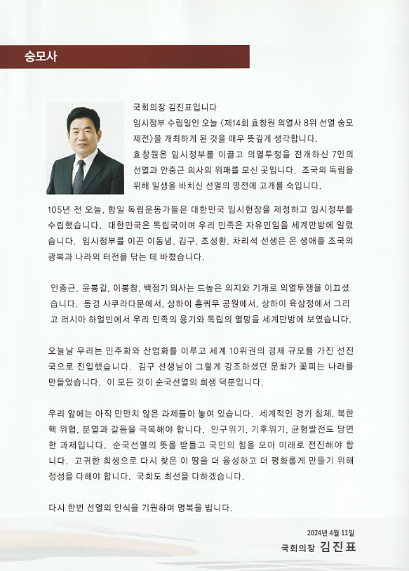 추모 축전 인사 1 페이지 > 효창원8위선열기념사업회